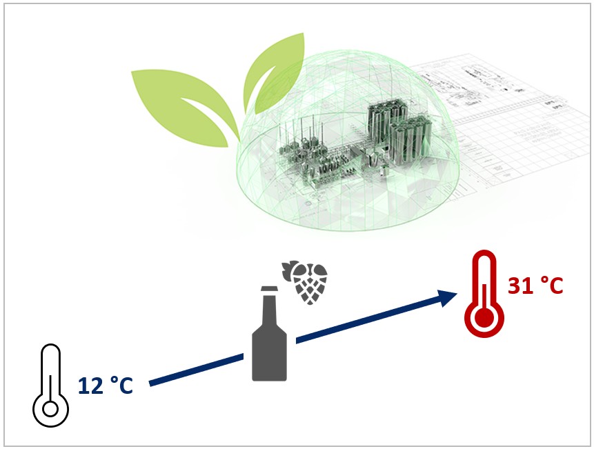 Filling and outside temperature: There is often a large difference between these two parameters in breweries. As a result, condensation forms after the filling process, and energy-intensive drying is needed to achieve trouble-free container labelling.