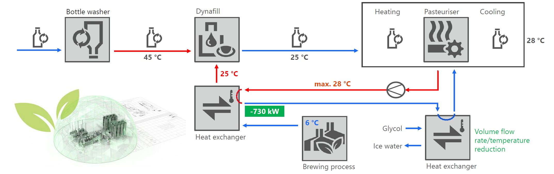 Krones conceptualises its machines as part of the bigger picture, meaning: We not only focus on the individual machine but incorporate it in overall concepts. When it comes to the Dynafill, this means: We are aware of the opportunities that warm filling offers for saving energy. We have thus developed a holistic concept where cooling energy can be recycled in other areas of the brewing or filling process.